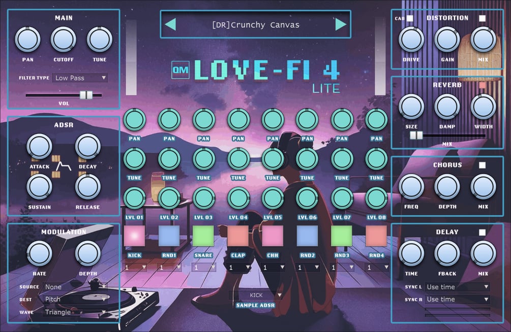 Love-Fi 4 Lite features a redesigned interface and offers a wide array of sounds categorized into Pads, Keys, Bass, Drums, Field Recordings, and sound effects. Each sound is carefully crafted to bring unique atmospheres to your tracks. The user-friendly interface ensures a seamless experience, providing intuitive controls to shape your sound. Easily adjust the ADSR envelope, low-pass/high-pass filter cutoff, LFO modulation, global volume, pan, and tuning.